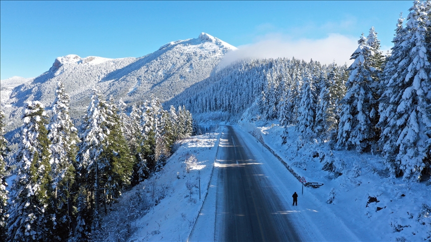 البياض الناصع للثلوج امتزج مع الغابات الكثيفة والحياة البرية الغنية، في مشاهد آسرة وثقتها عدسة طائرة مسيّرة (درون) للأناضول